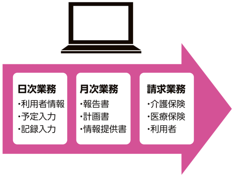 日々の記録入力が様々なデータに自動連動し、最低限の入力で事務業務の手間を省きます。