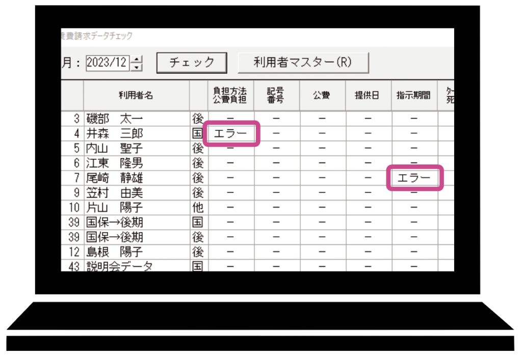 データチェック機能で入力漏れや、保険種類・公費の組合せ間違いを防止します。